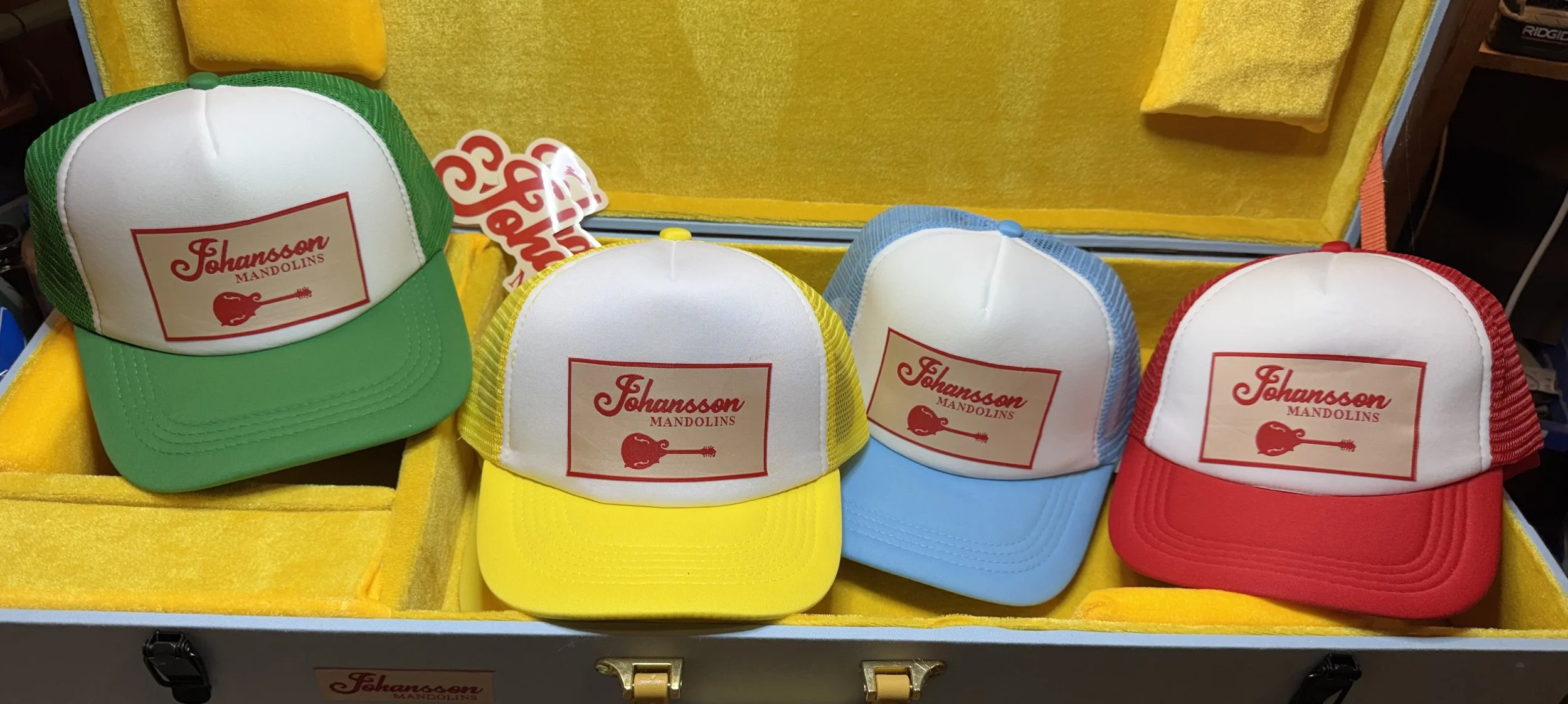 free hat and sticker with each purchase of a Johansson Mandolin!