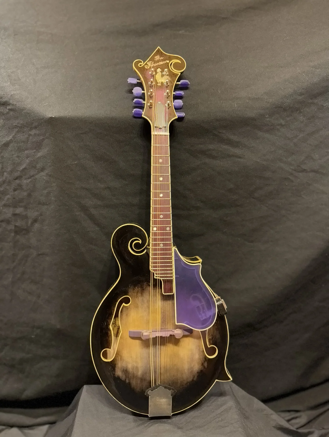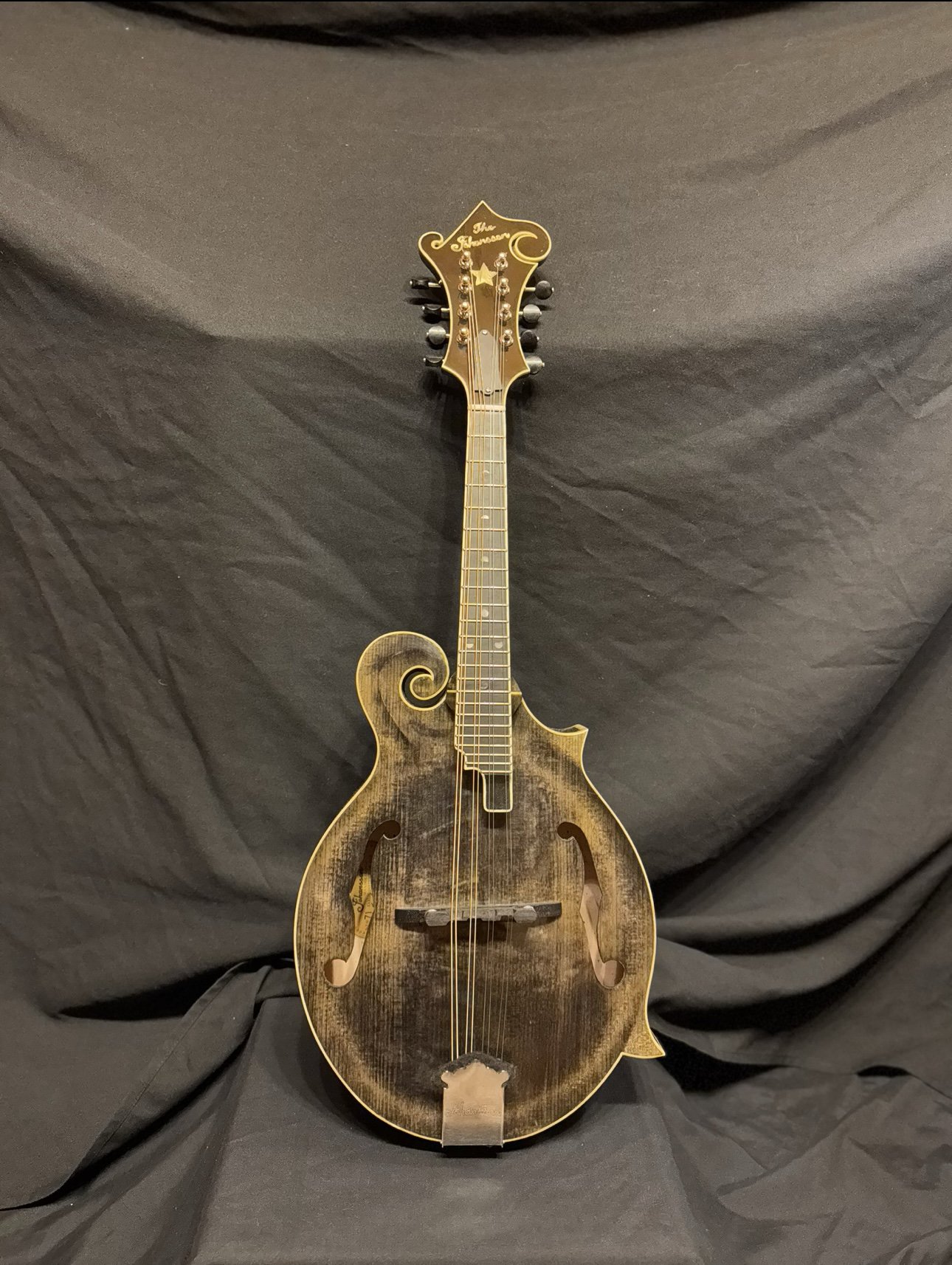 No.50 3-point Deluxe F5 mandolin with french polished cremona brown 1704 spirit varnish finish. 1 1/16” nut width, compound radius fingerboard with narrow low frets. Traditional profiled neck with truss rod reinforcement, double bound body, bound f holes, hinged tailpiece with hammer and chisel engraved tailpiece. multicolored hand cut old time western inlays and scrimshaw. Asymmetrical A braced adirondack spruce top, sugar maple back sides and neck. Adjustable ebony bridge set at 25/32'“ with standard setup. Gotoh machine tuners,single bound tortoise shell pickguard, pearloid truss rod cover, deluxe armrest.